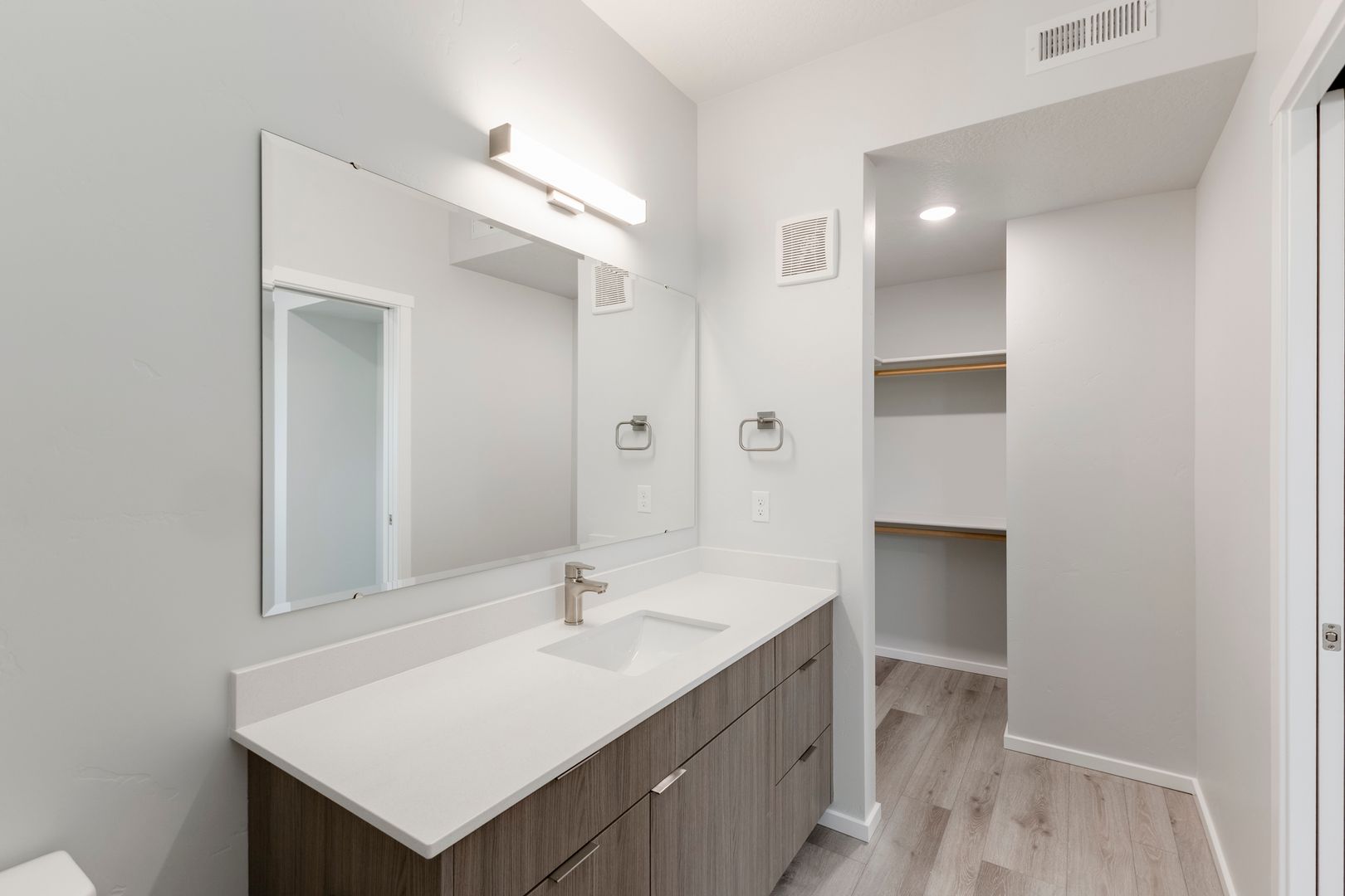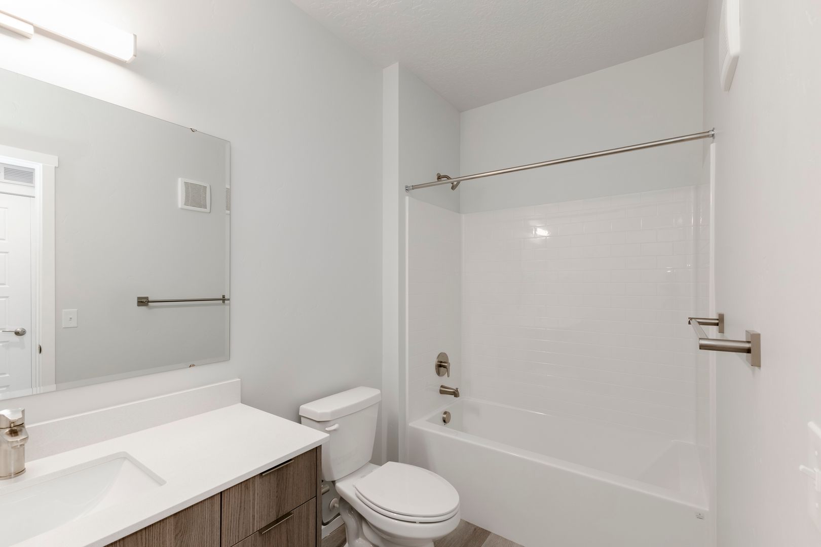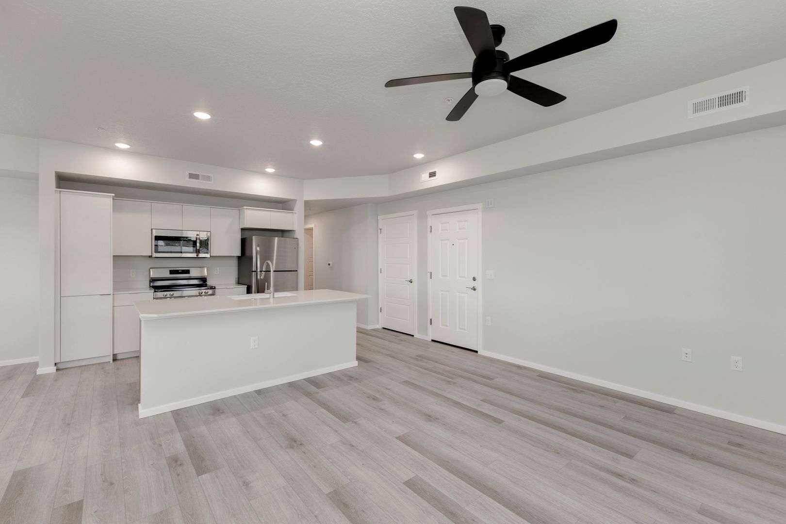 This large open concept floor plan is 1,155 sq. ft. and includes 2 bedrooms and 2 bathrooms. The kitchen boasts white cabinets and quartz countertops, opening up to a large living room and bonus dining nook! Just off the dining nook, you have access to your patio. Stainless steel appliances and beautiful finishes make this apartment feel warm and inviting.
