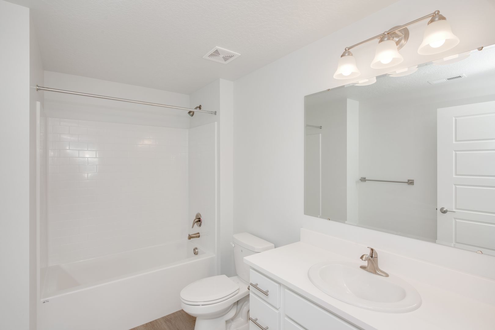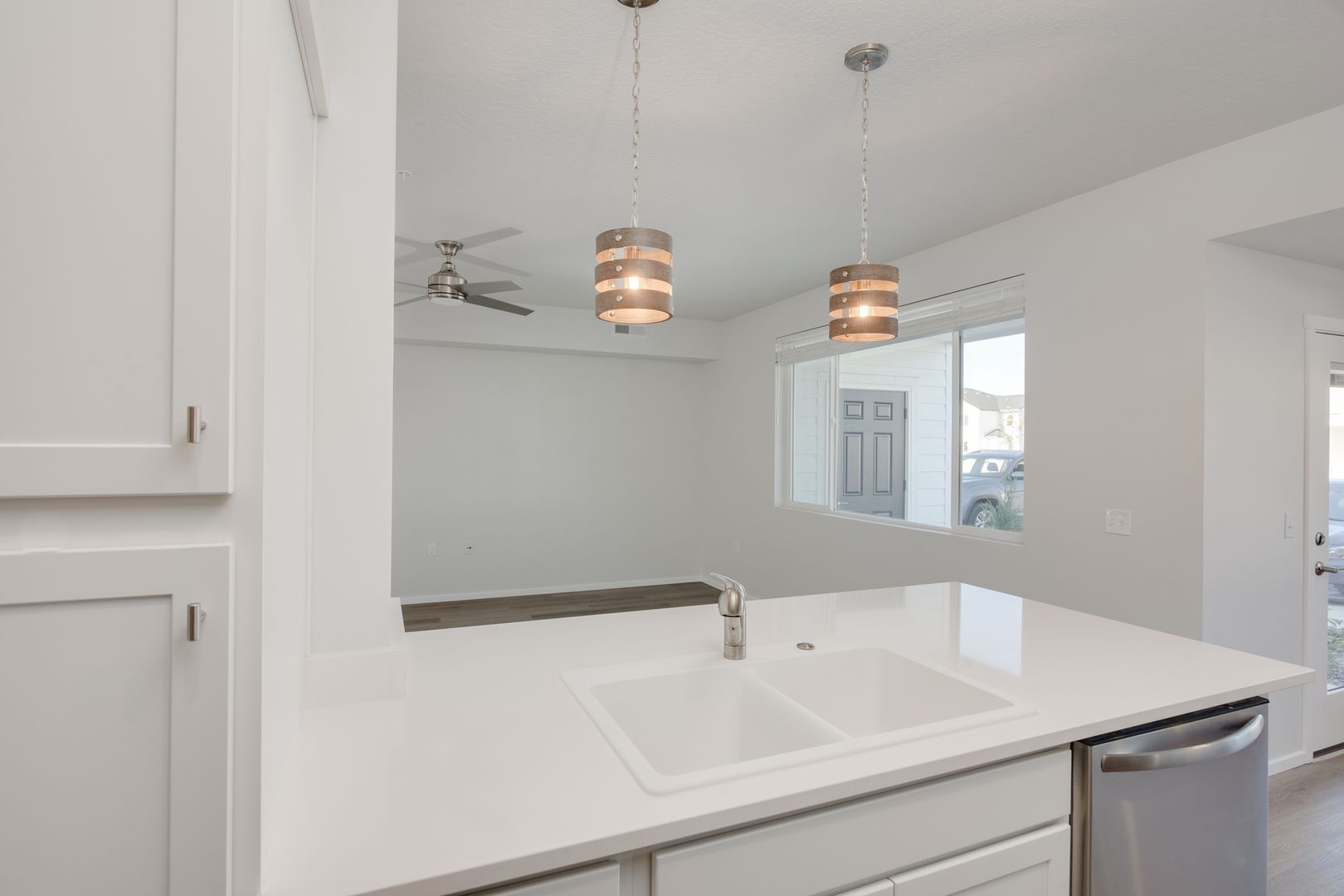 This large, open concept floor plan is 1,123 sq. ft. and includes 3 bedrooms and 2 bathrooms. The kitchen, with its white cabinets and quartz countertops, seamlessly connects to a spacious living room and dining nook, offering convenient access to the patio and private storage area.