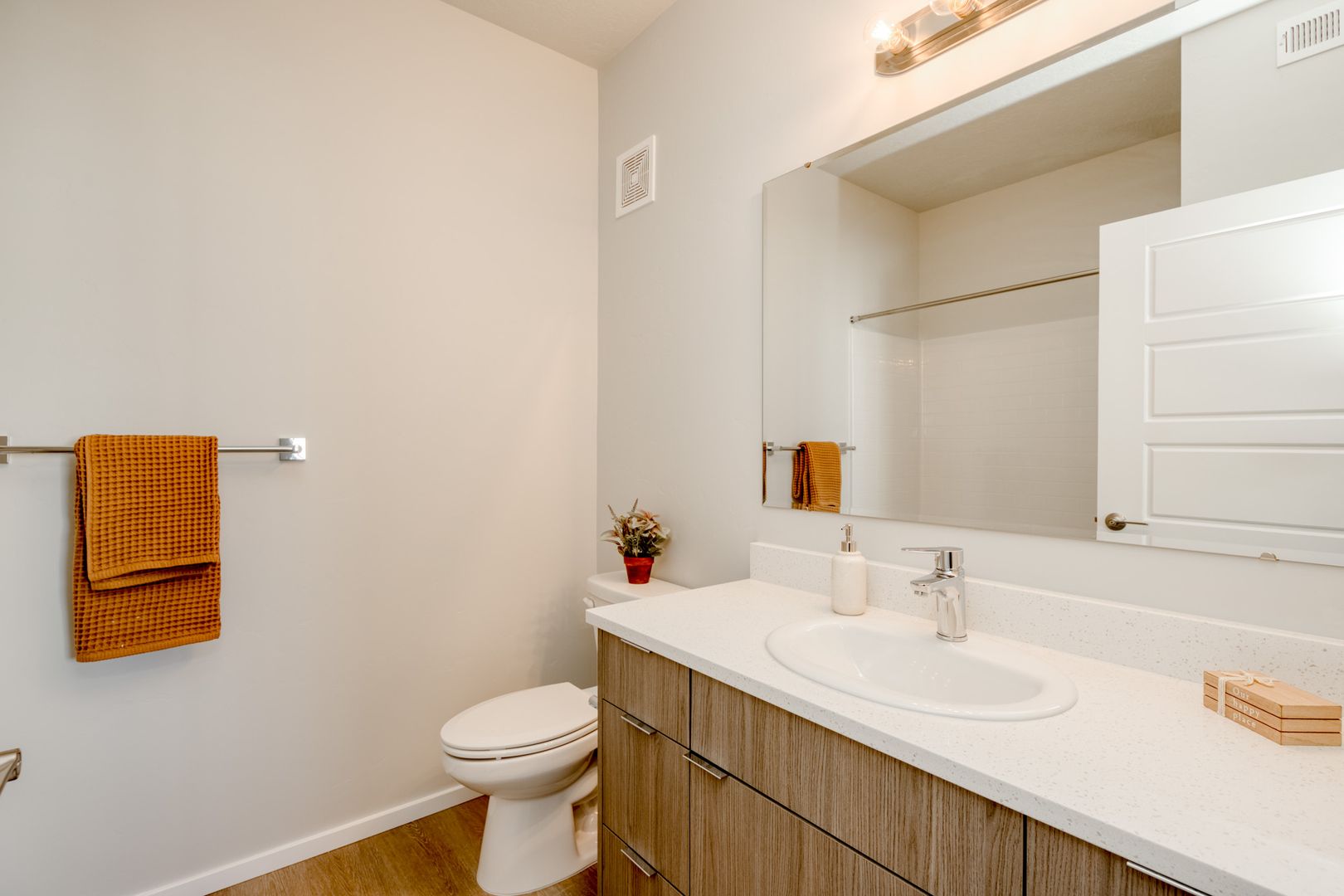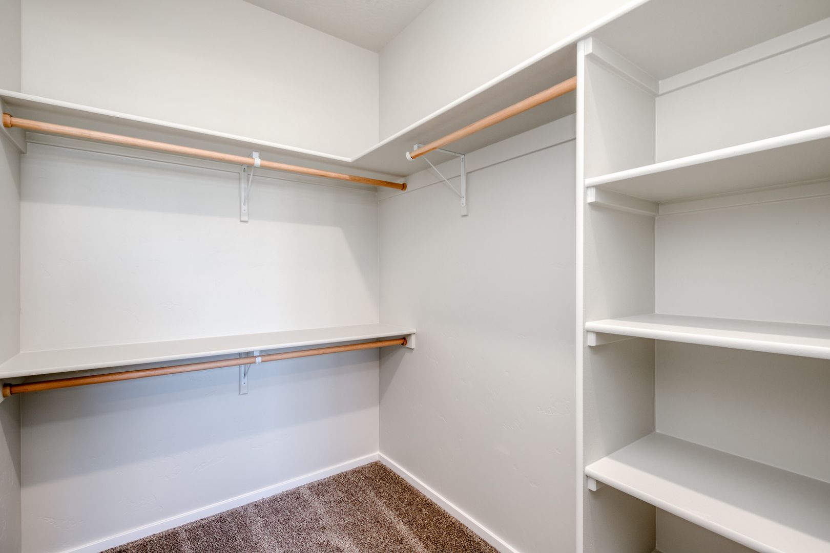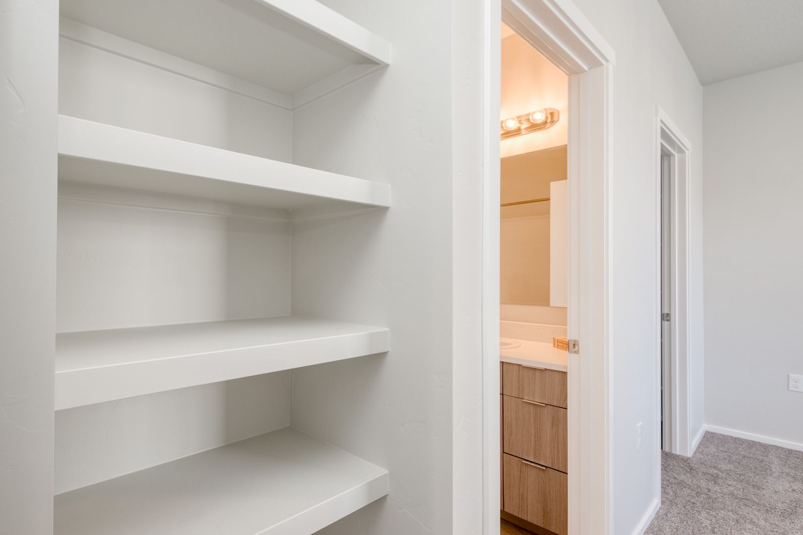 Additional shelving in each bathroom ensures plenty of storage space.