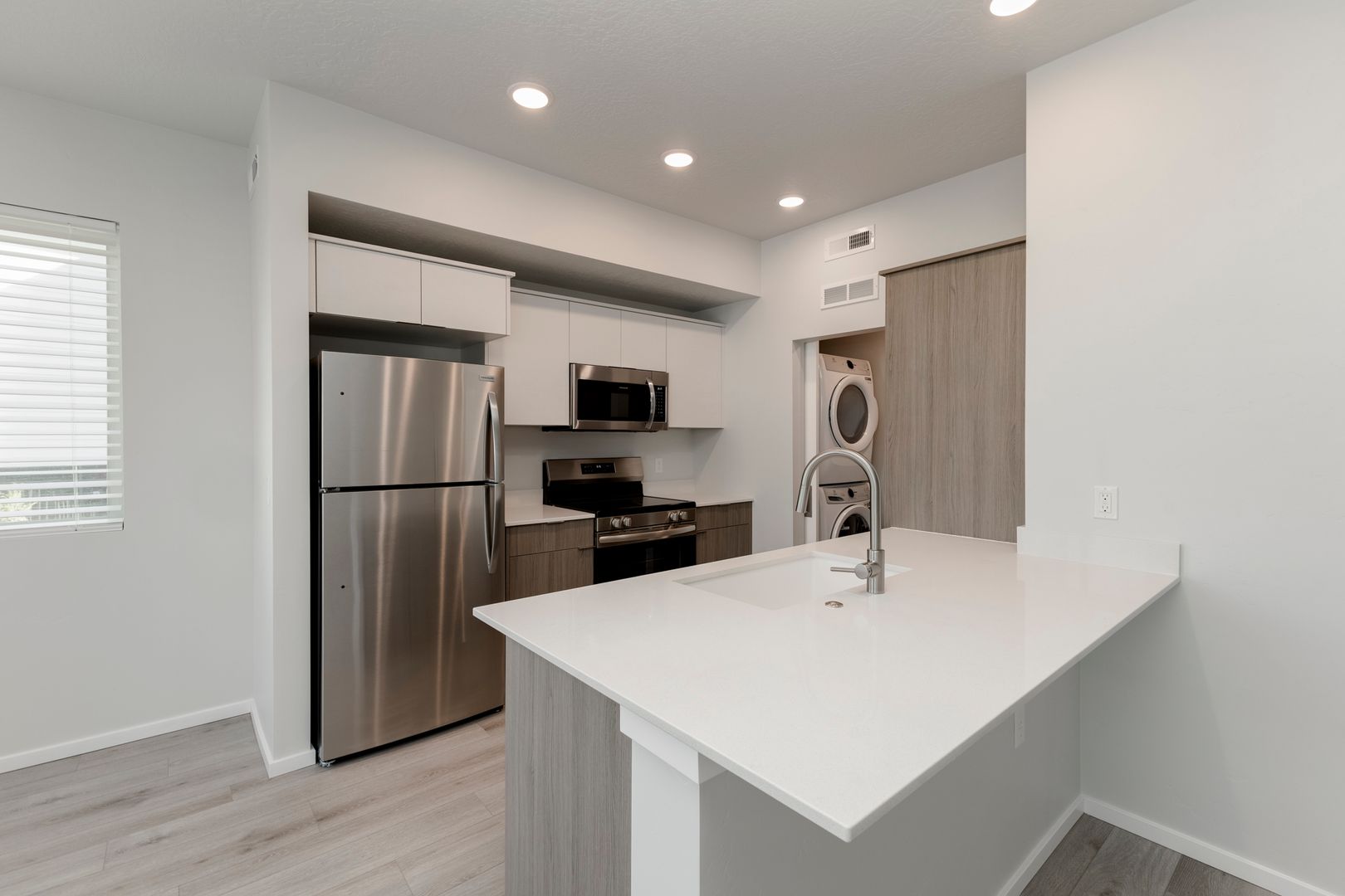 This large open concept floor plan is 1,195 sq. ft. and includes 2 bedrooms and 2 bathrooms. The kitchen boasts white cabinets and quartz countertops, opening up to a large living room and bonus dining nook! Just off the dining nook, you have access to your patio. Stainless steel appliances and beautiful finishes make this apartment feel warm and inviting.