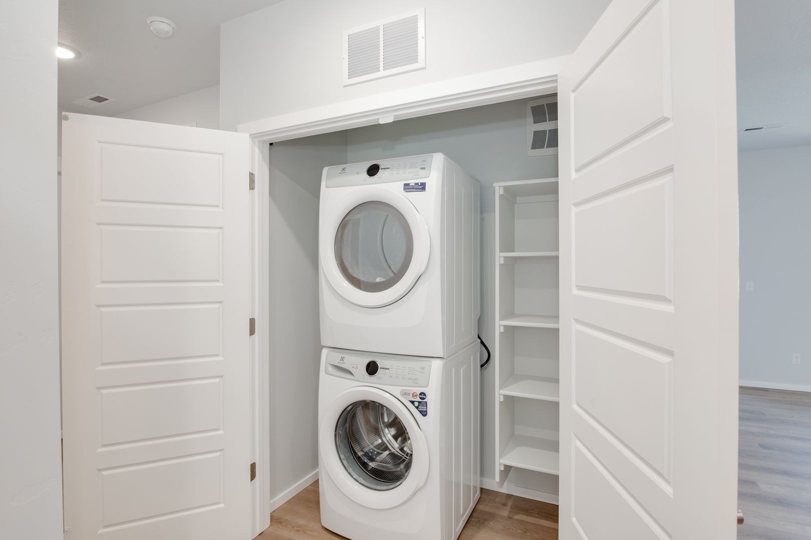 Laundry day is a breeze with Full sized washer and dryer and built-in shelving.