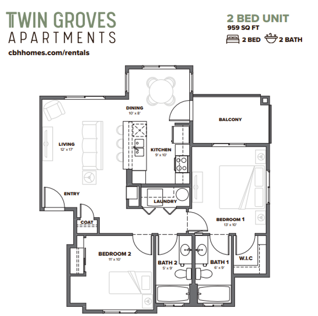 This large open concept floor plan is 959 sq. ft. and includes 2 bedrooms and 2 bathrooms.