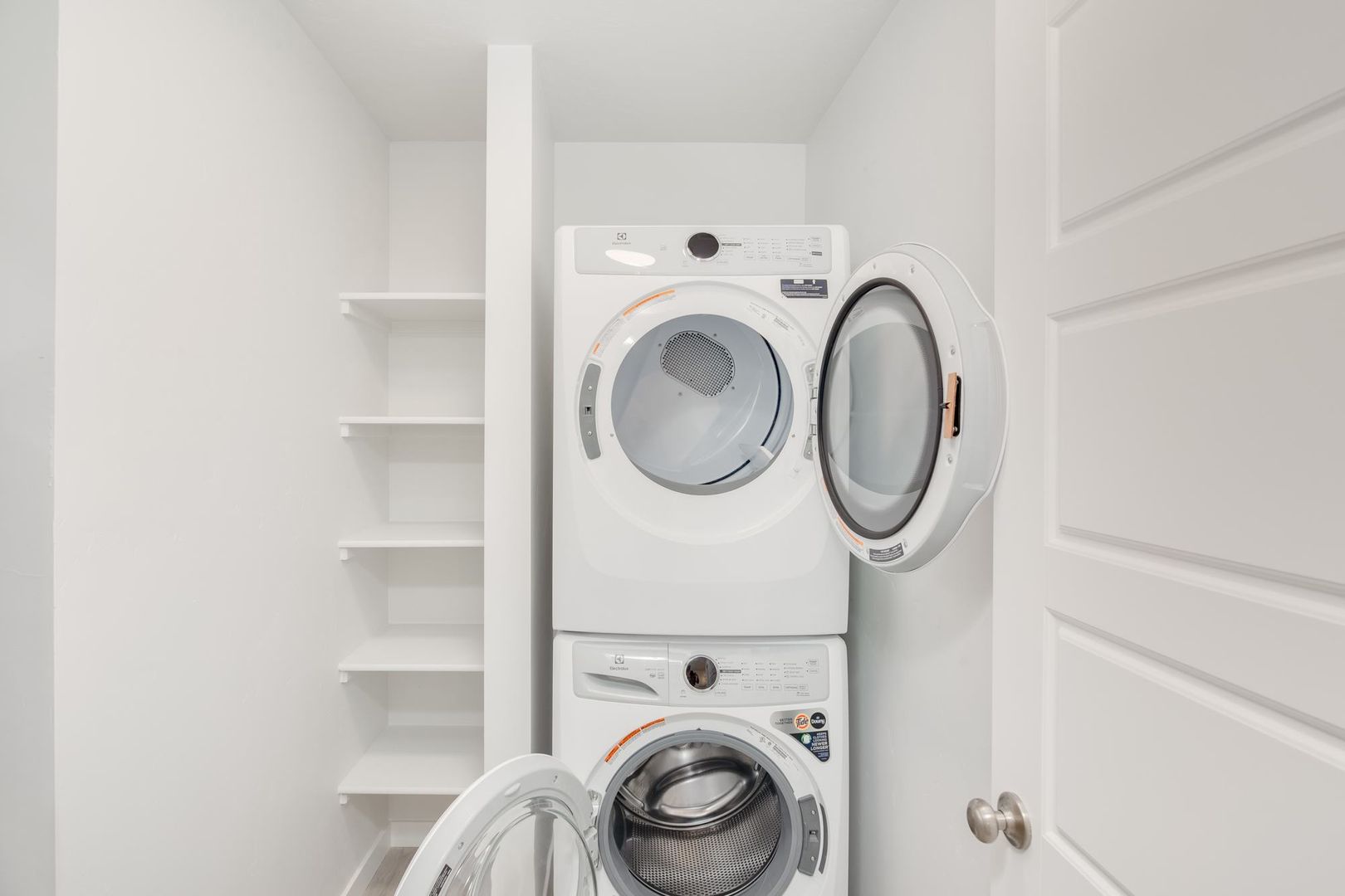 The half bath is off of the kitchen, an ideal location for guests. Upstairs the laundry room includes a full size washer and dryer. Water, Sewer and Trash are also included.