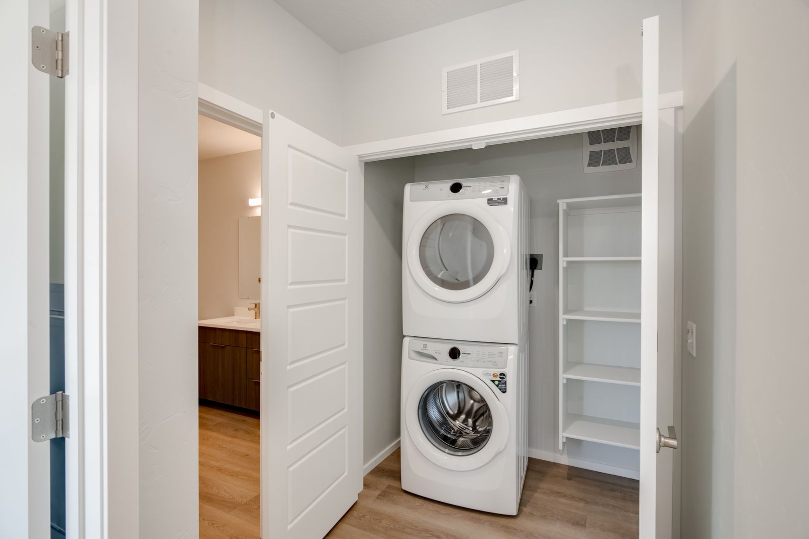 Laundry day is a breeze with Full sized washer and dryer and built-in shelving.